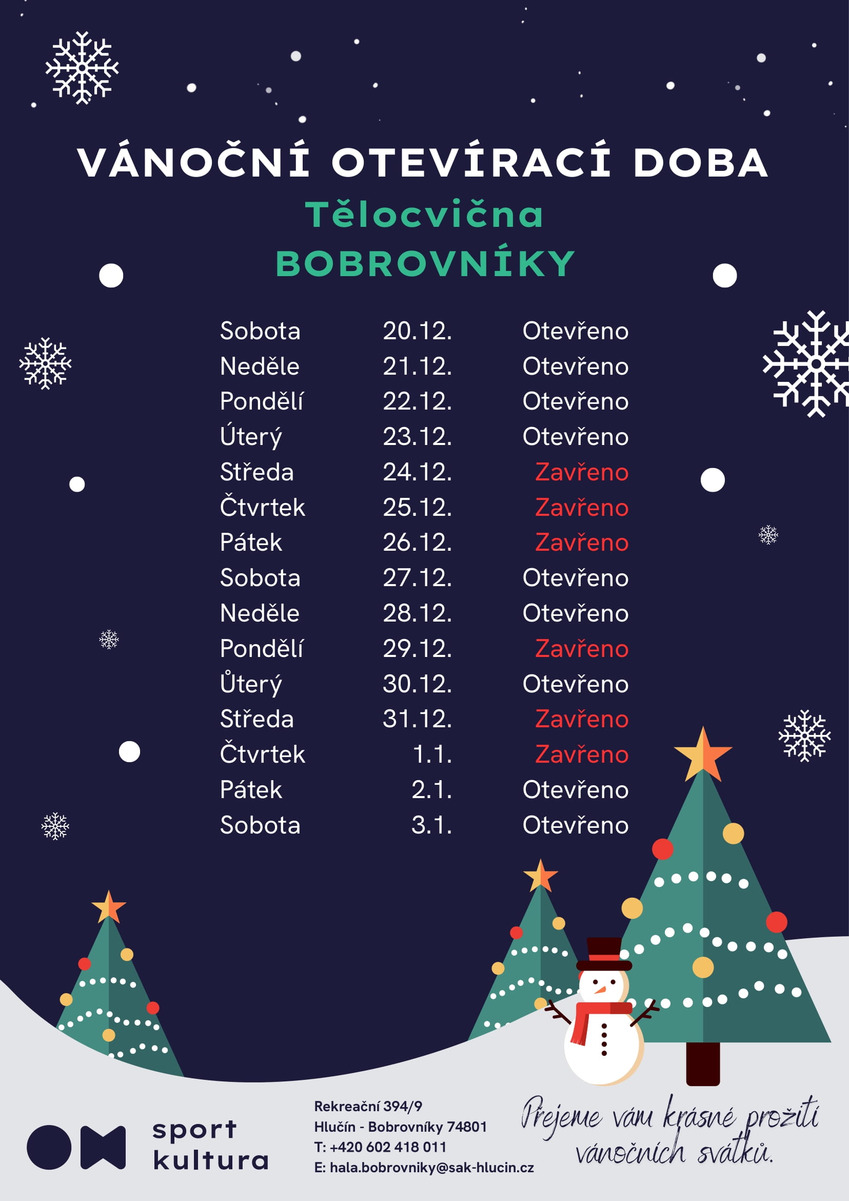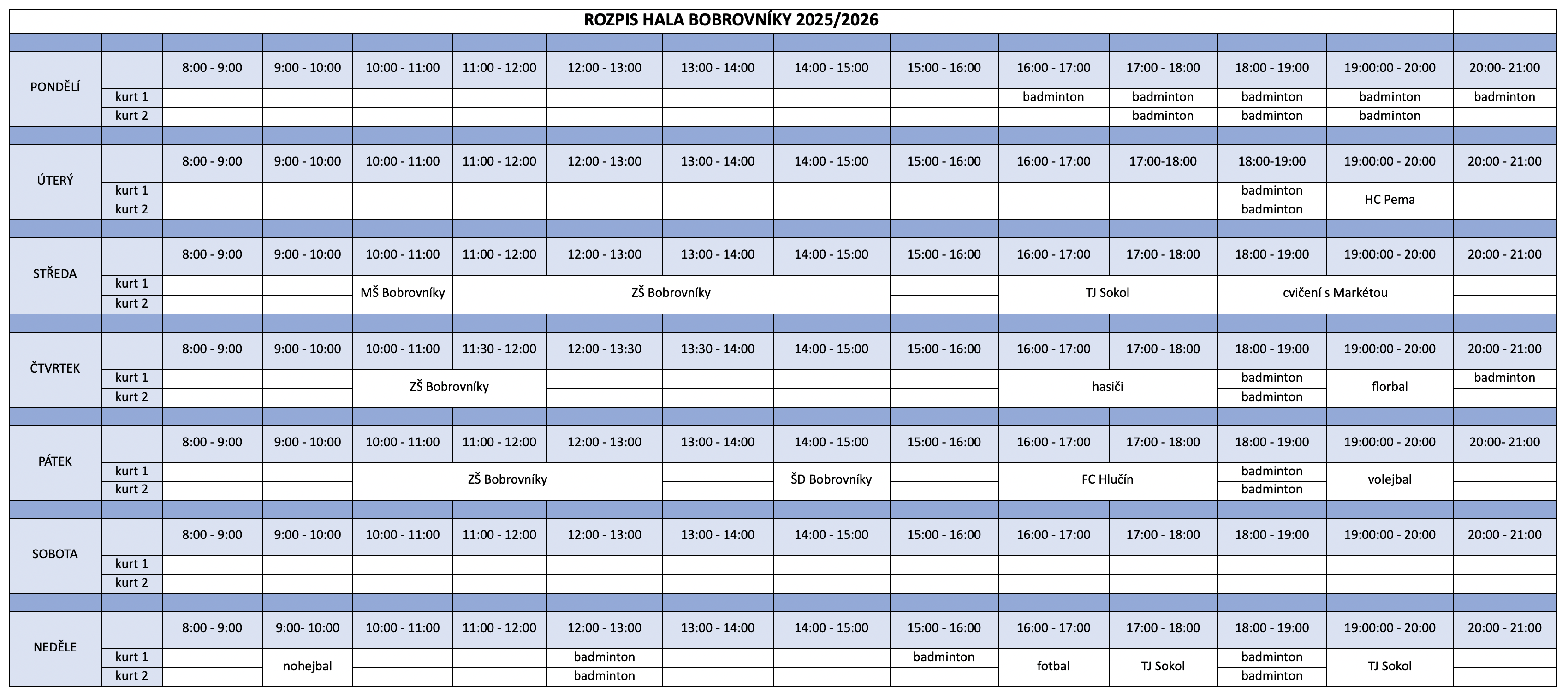 Objednávky na tel. čísle: (+420) 602 418 011 nebo na emailu: hala.bobrovniky@sak-hlucin.cz